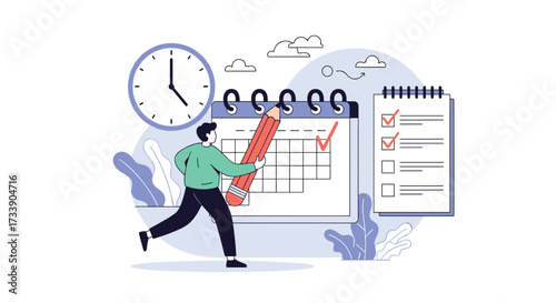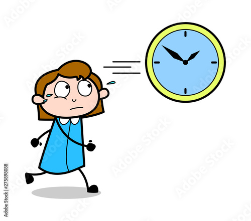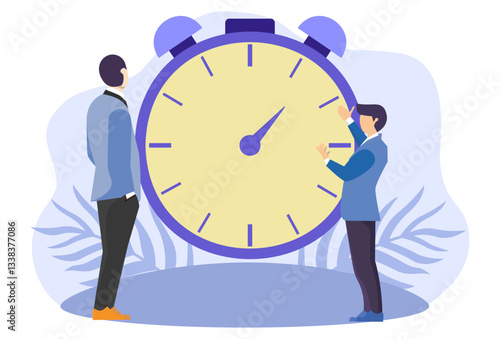 Time is up concept vector flat style design illustration. Tiny characters business people trying to turn back hands of huge clock. Time management concept for web banner, website page etc.
