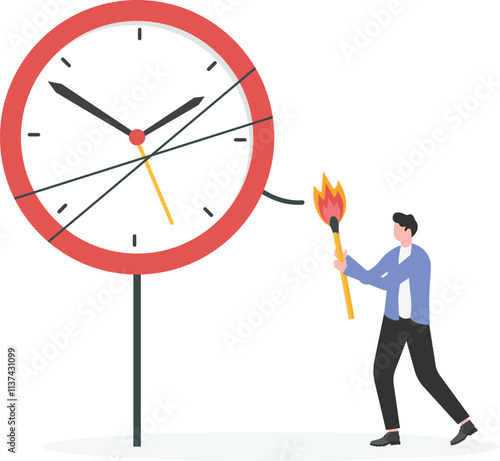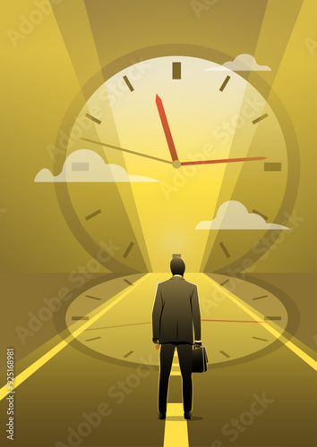 Businessman walking up stairway leading to the center of mechanical clock, vector illustration in paper art style. Time management concept for web banner, website page etc.