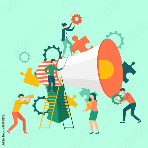 Tiny people making fruit cocktail, vector flat illustration. Summer fresh cold drink with berries, orange, mint leaves. Bartender preparing summer refreshing tasty and healthy beverage.