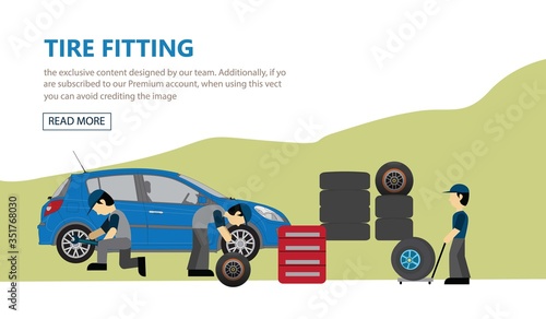 Tire change, auto service concept vector illustration. Workers changing auto wheel tires, flat style design elements.