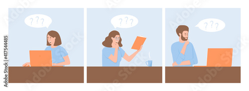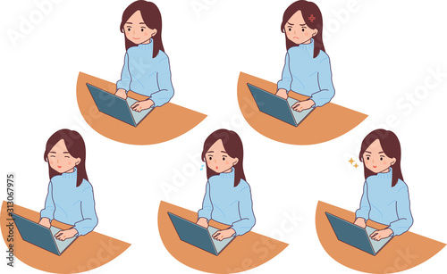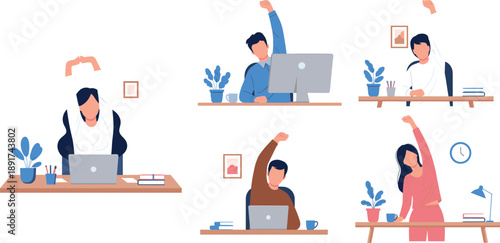 Tired and cheerful woman character at work scene set. Exhausted and energetic female worker cartoon vector illustration