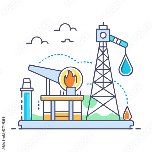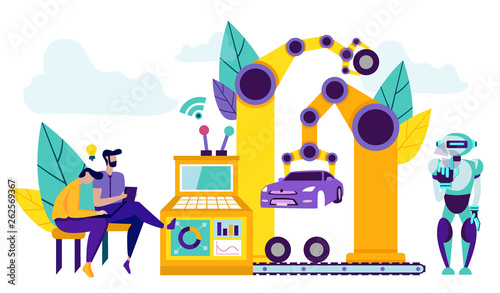 Huge ketchup bottle and micro male characters, vector illustration. Tomato sauce processing and manufacturing plant, tomato industry concept for web banner, website page etc.