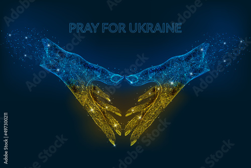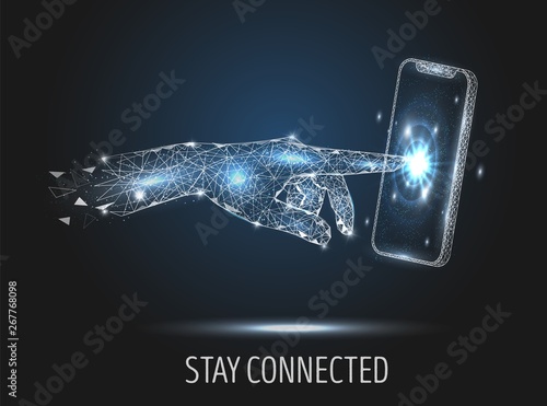 Vector polygonal art style human touching hands. Low poly wireframe mesh with scattered particles and light effects on grey background. Poster banner design template.