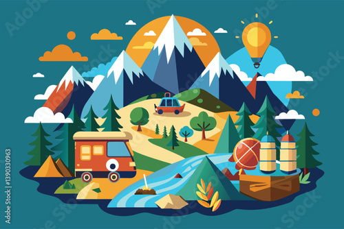 Tour agency advertising poster banner. Vector flat illustration. Mountain, kite, campfire, tent, backpack, dollar coin and charcoal lighter fluid bottle. Camping nature tourism concept.