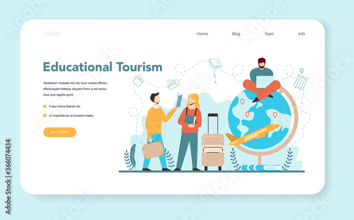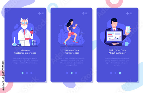 Tourist, nature photographer taking photo of red fox with camera. Mobile app screens. Vector banner template for website and mobile development. Web site and UI design illustration.