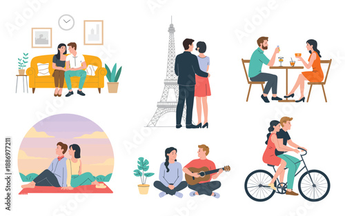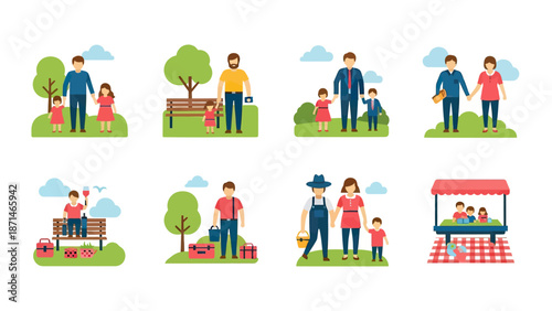Vector illustration of travelers males, females, families going hiking, camping, visiting zoo and other famous places. Tourist people symbols, icons isolated on white background. Flat style design.
