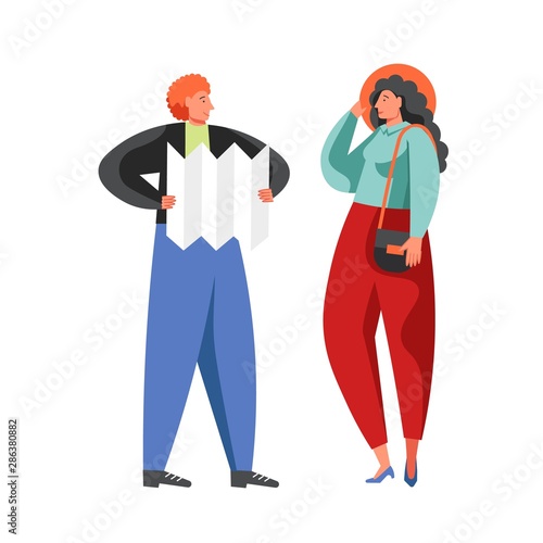 Tourist couple characters with travel map, planning route, vector flat isolated illustration. Summer traveling, vacation, tourism, adventure concept for web banner, website page etc.
