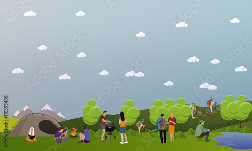 Vector illustration of travelers going hiking, camping with traveling equipment. Tourist people flat style design.