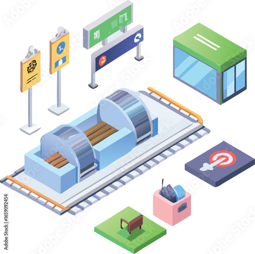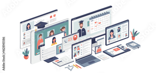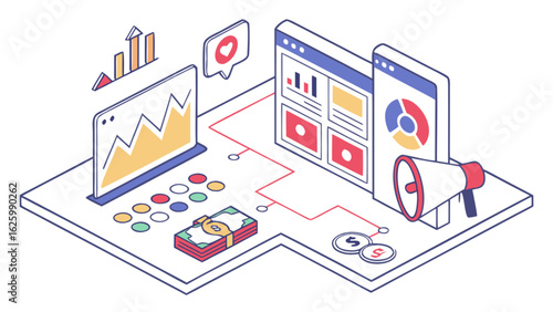 Trailer online vector illustration. Isometric 3 d camper car or motor home for sale or rental on laptop keyboard. Online shopping, e-commerce concept design elements isolated on white background.