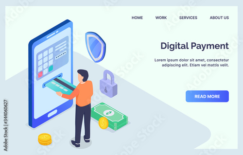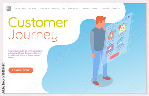 Train ticket vector website template, web page and landing page design for website and mobile site development. Traveler man buying, booking train ticket online using smartphone.