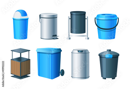 Trash bin for city streets and parks. Metal cans for garbage and waste. Vector set in 3d realistic style. Trash bin isolated on white background. Urban design for public sidewalks.