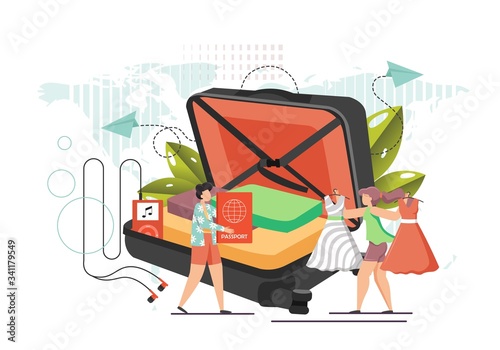 Happy woman packing huge suitcase for travel, vector flat style design illustration. Traveler packing luggage, preparing for summer holidays. Traveling, tourism, travel and vacation concept.
