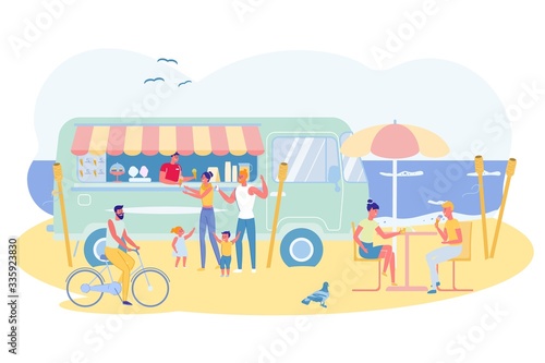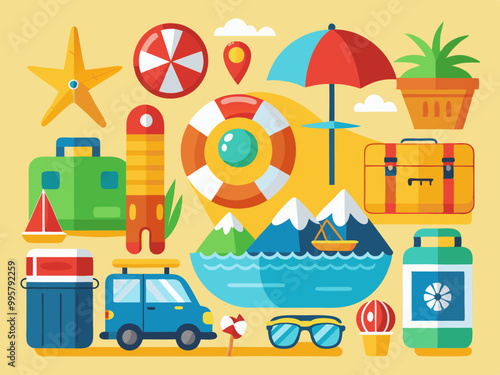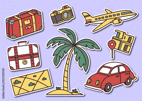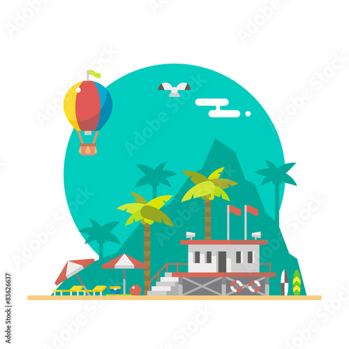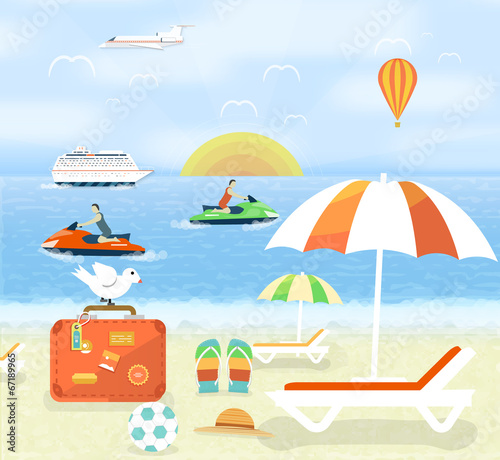 Travel concept vector illustration in flat style design. Airplane flying above tourists luggage, ship, palms, beach. Vacation and tourism background.