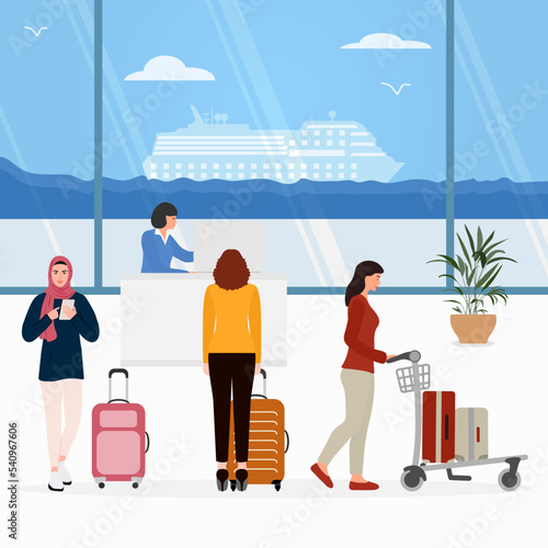 Travel couple back view, flat vector illustration. man and woman with traveling bag holding hands. Romantic vacation, summer holidays, honeymoon, world travel.
