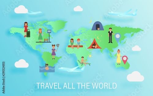 Travel infographic in vector isometric style. Camping outdoor activity. Flat 3d isometric design. Family vacation and hiking. Camp in forest.