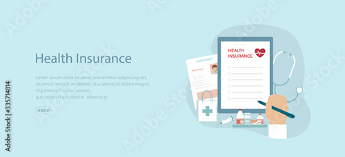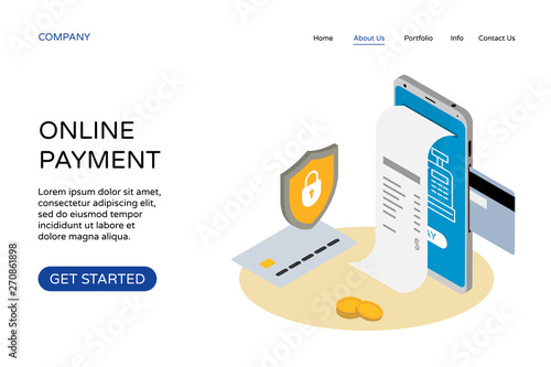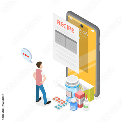 Travel insurance online, vector illustration. Smartphone with insurance policy, shield, suitcases, passenger liner, finger tapping buy button. Isometric composition for poster, banner, website page.