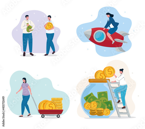 Travel people isolated vector scene. Adventure set. Man and woman tourist cartoon character visit foreign country illustration. Person at airport, shopping tour on vacation