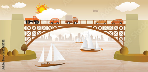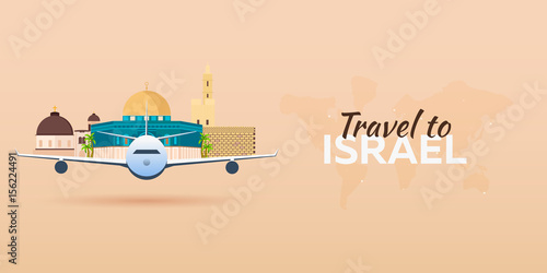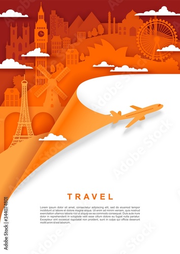 Travel poster, banner template, vector illustration in paper art style. Plane flying in sky and world famous landmark silhouettes. Worldwide tourism, flight tour, air travel.