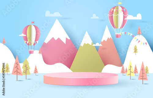 Travel tickets in box, decorated Christmas tree with balls, winter night forest landscape, vector illustration in paper art style. Christmas tour, winter vacation.