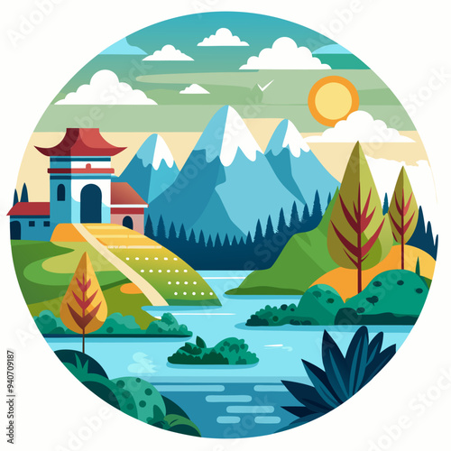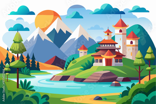 Traveling camper van going down the road near mountains and beach, vector illustration in paper art style. Beautiful sea coast and mountain landscape. Green hills scenery. Tourism, road trip.