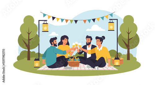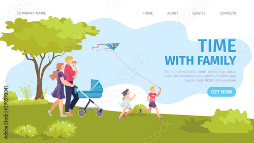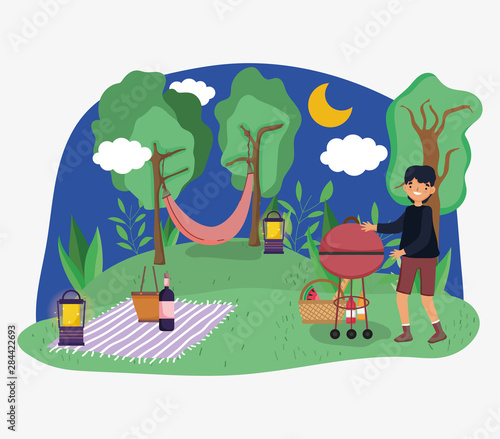 Trip to mountains poster, banner template. Happy woman sitting by campfire in forest, flat vector illustration. Summer vacation, hiking, camping. Explore nature, mountains, woods.