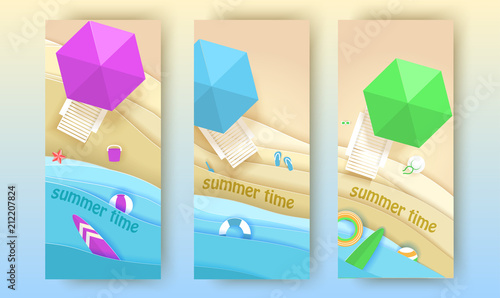 Tropical beach banners set in paper art style. Vector top view paper cut illustration. Summer holiday concept poster template. Craft origami