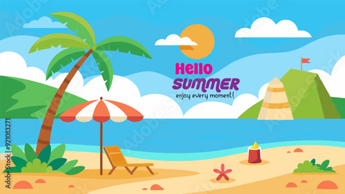 Tropical beach lifeguard at work flat vector. Tropical resort with people resting swimming in sea or ocean and lifesaver rescue team cartoon illustration. Tropical landscape, travel and vacation