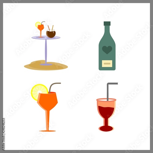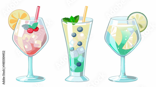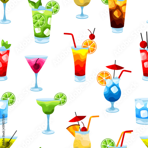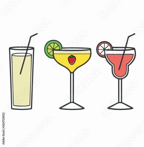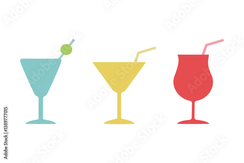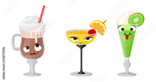 Tropical drink cocktail character flat vector set. Cute alcohol beverage character in glass icon isolated on white background. Funny happy face of alcoholic sweet liquid cartoon
