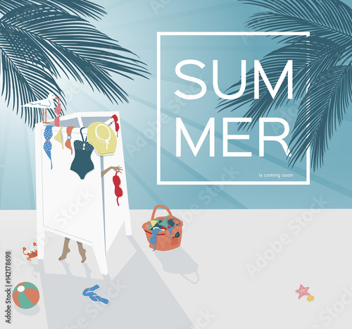 Tropical freshness wet wipes advertising poster design template, vector realistic illustration. Moistened cosmetic napkins for skin care in pack, coconut fruit, palm leaves background, copy space.