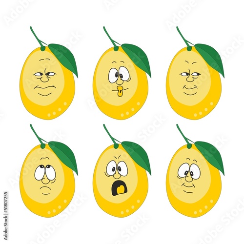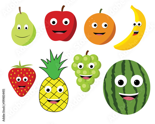 Tropical fruit cocktail cartoon face flat vector set. Kawaii cartoon character illustration. Exotic drink in glass with straw and piece of pineapple, orange and mint leaves isolated on white