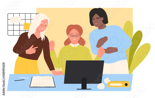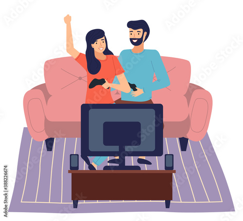 Two boys video game player vector illustration. Winner and looser gamer front of television screen isolated on white background. Happy and sad children