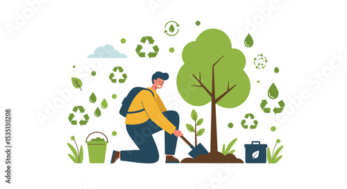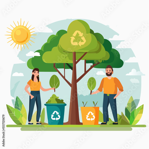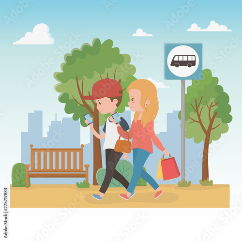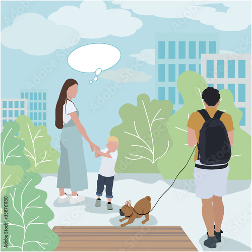 Two happy girls taking selfie, flat vector illustration. Young women, best friends walking in city park together with pet dog. Female friendship.