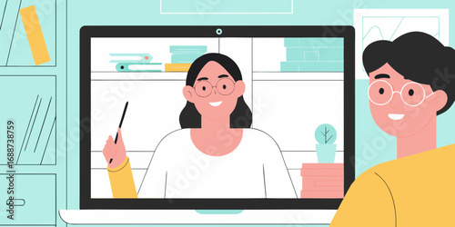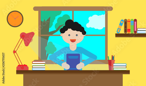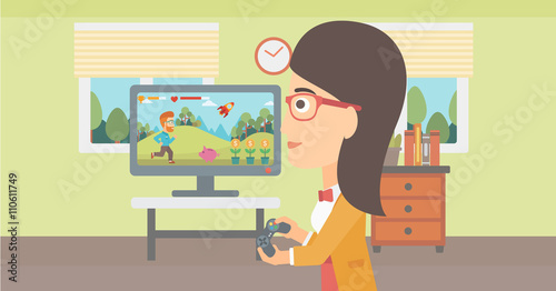 Kids play video game console on tv vector illustration. Computer room for gamer. Two young boys player looking at television screen having fun gaming activity at home