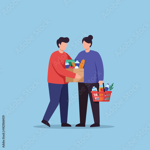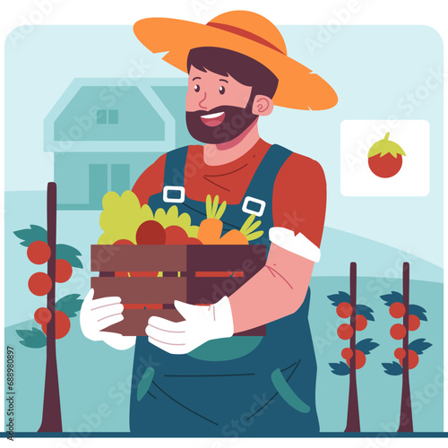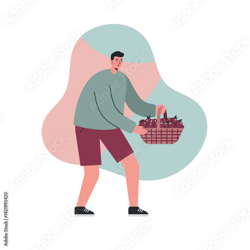 Two men gardeners carrying wooden crate with apple fruit vector icon isolated on white background.