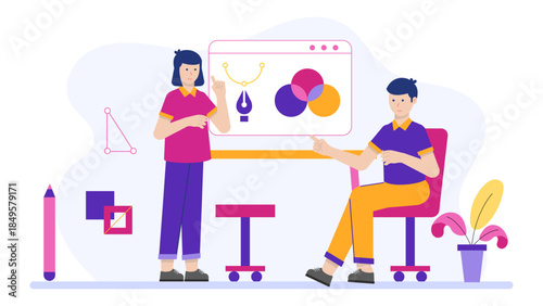 Typography services, vector illustration. Huge palette and micro characters expert designers helping customer to select color. Polygraphy, printing house composition for web banner, website page etc.