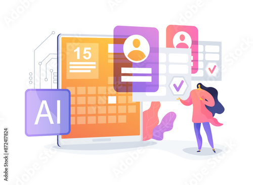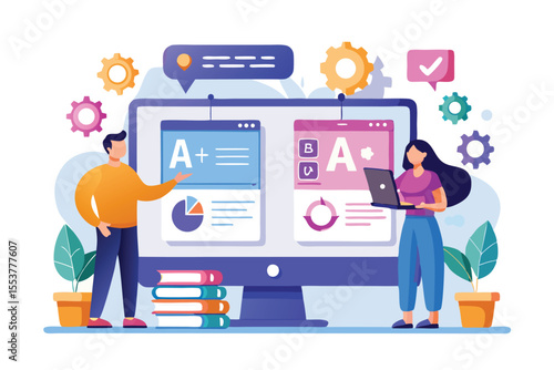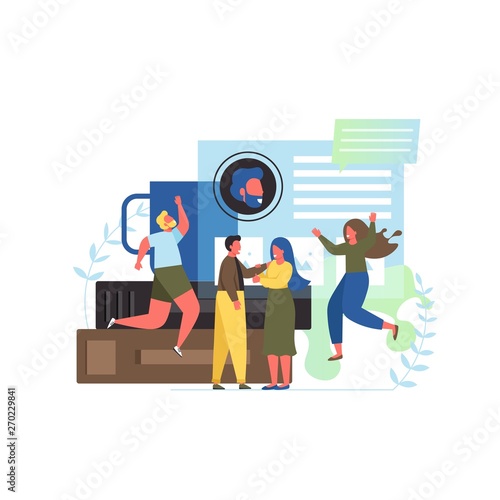 Typography services, vector illustration. Printing process with huge offset printers and micro male and female characters workers. Printing house composition for web banner, website page etc.