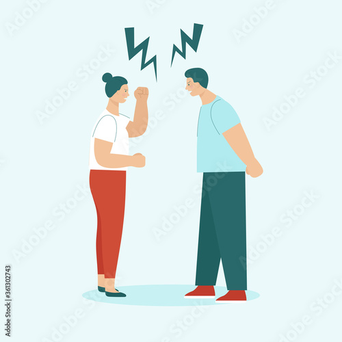 Unhappy man and woman couple having conflict standing separately over broken heart on background. Divorce, crisis and bad relationship in family vector illustration