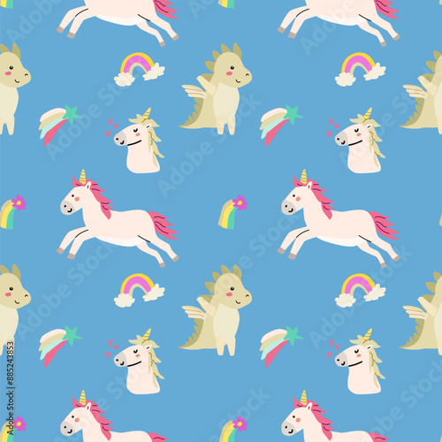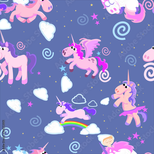 Magic unicorn seamless pattern. Vector hand drawn flying on balloons romantic unicorns with rainbows and clouds.