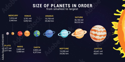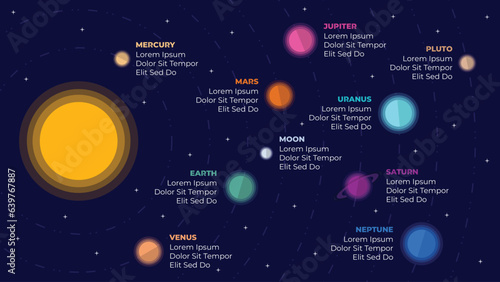 Uranus and its moons. Vector educational poster, scientific infographic, presentation. Miranda, Ariel, Umbriel, Titania and Oberon major Uranus satellites. Astronomy science, planets exploring concept