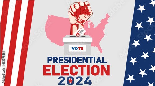 USA presidential election day concept vector illustration. Hand putting voting paper in the ballot box with american flag on background. Voting concept in flat style.