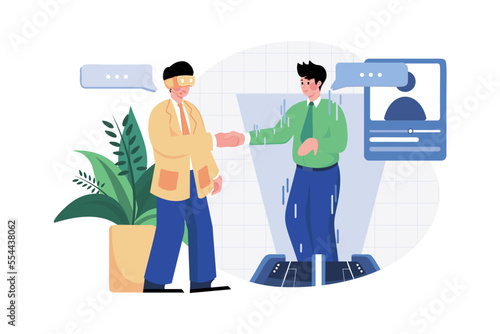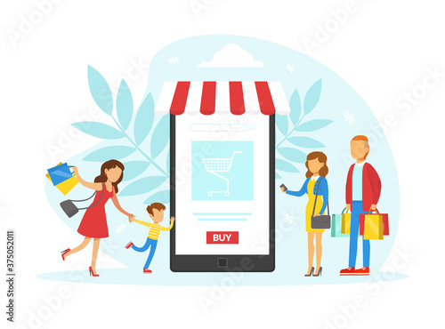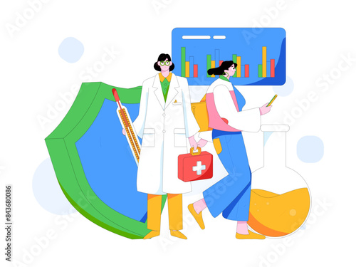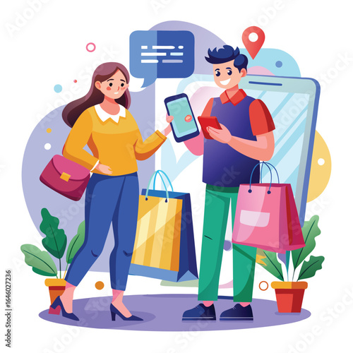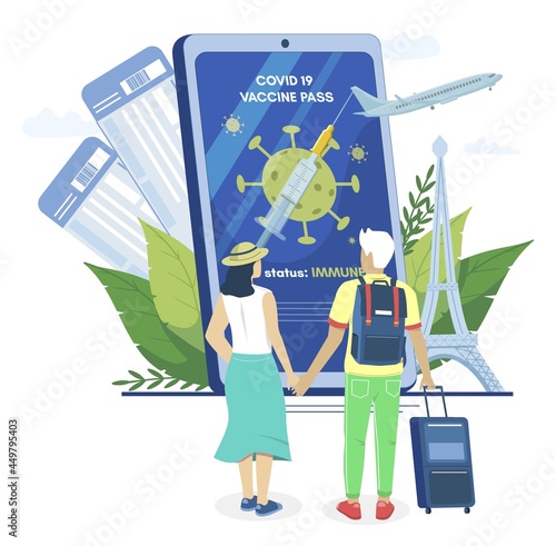 Vaccinated for Covid-19 traveler couple looking at huge smartphone with vaccine passport or certificate, flat vector illustration. Digital covid travel certificate.
