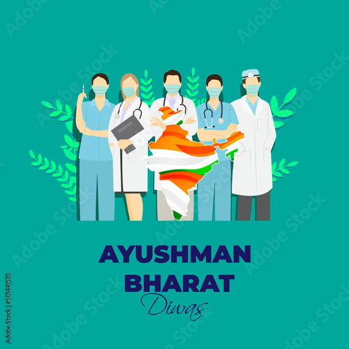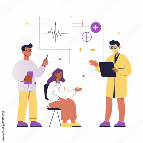 Vaccine research, flat vector illustration. Group of medical scientists in lab coats, face masks and glasses working in science laboratory developing vaccine against coronavirus disease Covid-19.