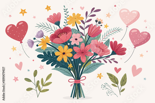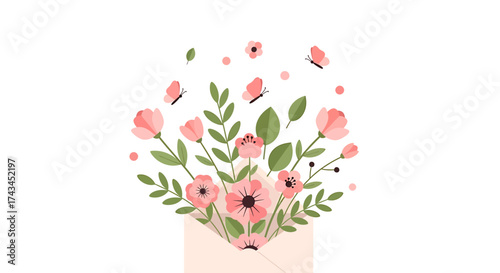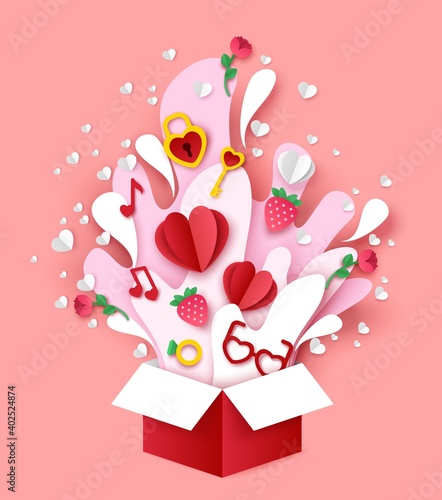 Open gift box with hearts, strawberries, music notes, key from heart lock flying out of it. Vector illustration in paper art style. Happy Valentines Day greeting card poster, banner design template.
