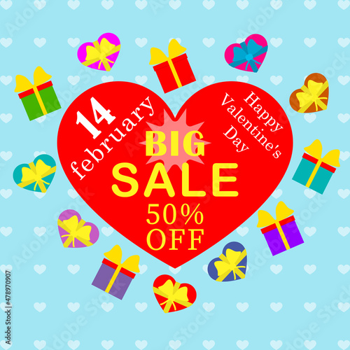 Valentines Day sale poster, banner design template. Vector illustration in paper art craft style. Speech bubble with hearts, hot air balloons, percent discount signs flying out of megaphone.