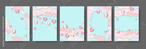 Valentines Day social media story, post vector template. Paper cut craft style hearts flying high in the sky. Romantic love creative composition for poster, banner, cover, card.