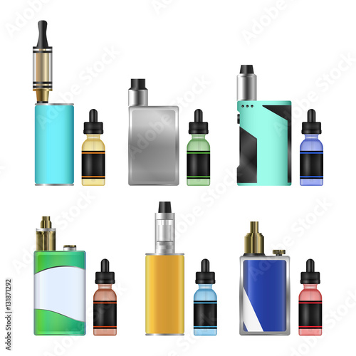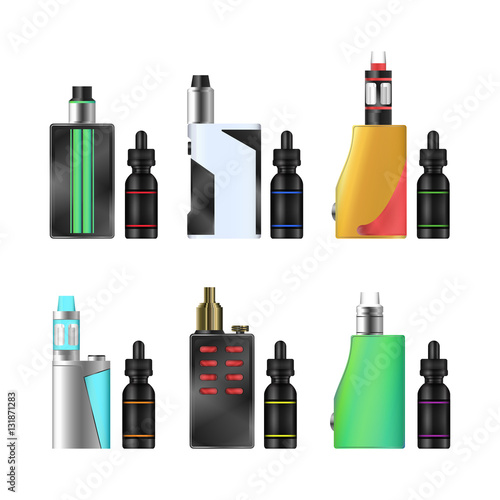 Smoking alternative vape and e-liquid bottle icon set, vector illustration isolated on white background. Electronic devices for smoking. Vaper, vaping cigarettes and liquids.