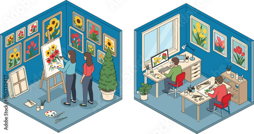 Laundry service vector flat 3d isometric illustration. Cutaway laundry interior with reception, ironing room, commercial and self-service laundry.