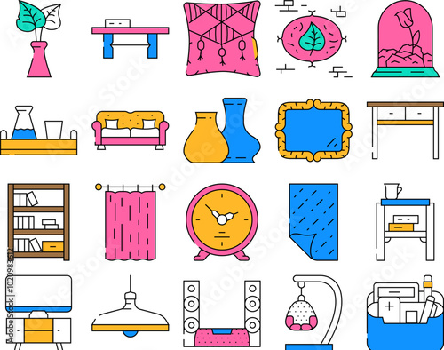 Vector 3d printer flat thin line icon set. Ceramics, medical, food and house 3d printing technologies concept design elements isolated on white background.