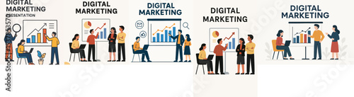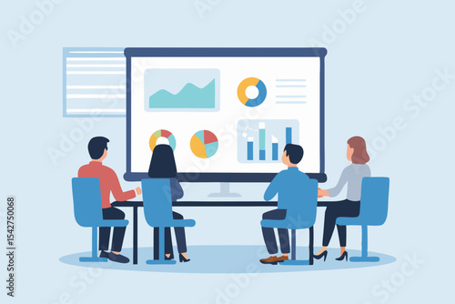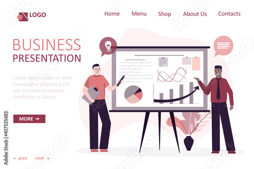 Vector banner concept with business presentations and meetings. Flat design of business people or office workers. Office interior.