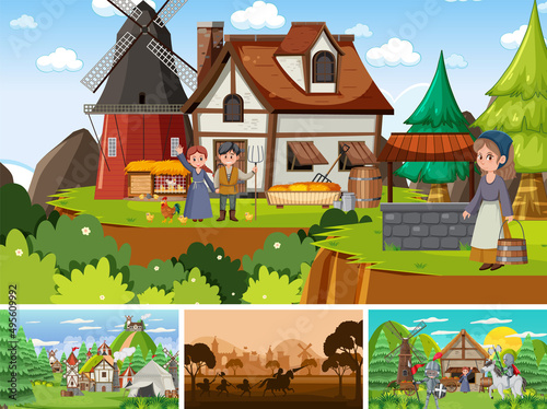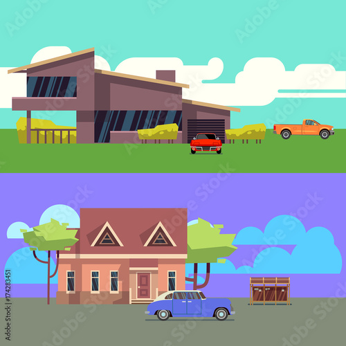 Vector banners of village life. Farming and cattle breeding, harvesting wheat and beekeeping. Agriculture, village activities. Flat design
